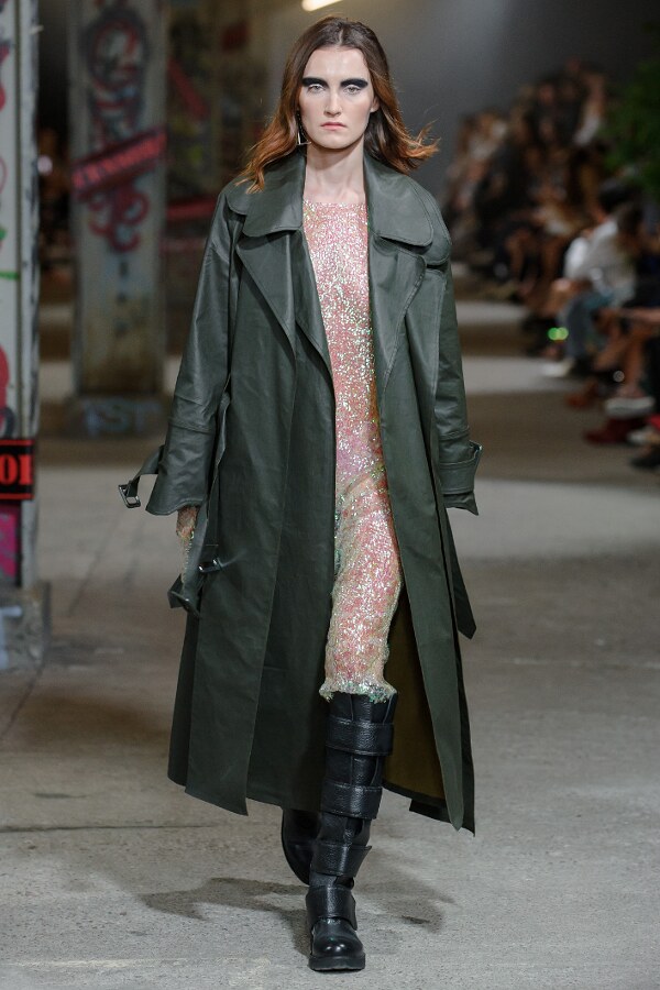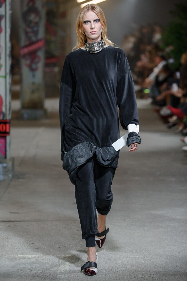 Zadziorne były nie tylko sukienki. Bo trzeba mieć też sporo rockowej charyzmy na granicy tupetu, a na pewno już lekkiego focha, by nosić najnowsze futra duetu. Ostentacyjnie próżne. Pachną Peweksem (i jeszcze te bezwstydne kabaretki!), drogim bazarem (w sam raz a propos Nocnego Marketu) oraz Ewą Kasprzyk z filmów przełomu lat 80. i 90. – Sztuczne! W stu procentach! – uspokajał mnie przed i po pokazie Rafał. No widzę, że sztuczne; z drugiej jednak strony MMC to diabeł, który zna się na tkaninach i surowcach jak mało kto i jak mało kto potrafi dobrać takie, by udawały swoje przeciwieństwo. Jedwab jako poliester? Proszę bardzo. W drugą stronę? Jak najbardziej. To, oczywiście, prymitywne z mojej strony uproszczenie, bo Rafał wraz z Iloną Majer często sięgają po materiały tak zaawansowane i nowatorskie, że potrzebny jest do nich kilkuzdaniowy opis.