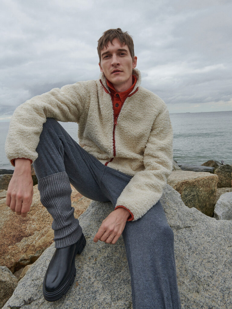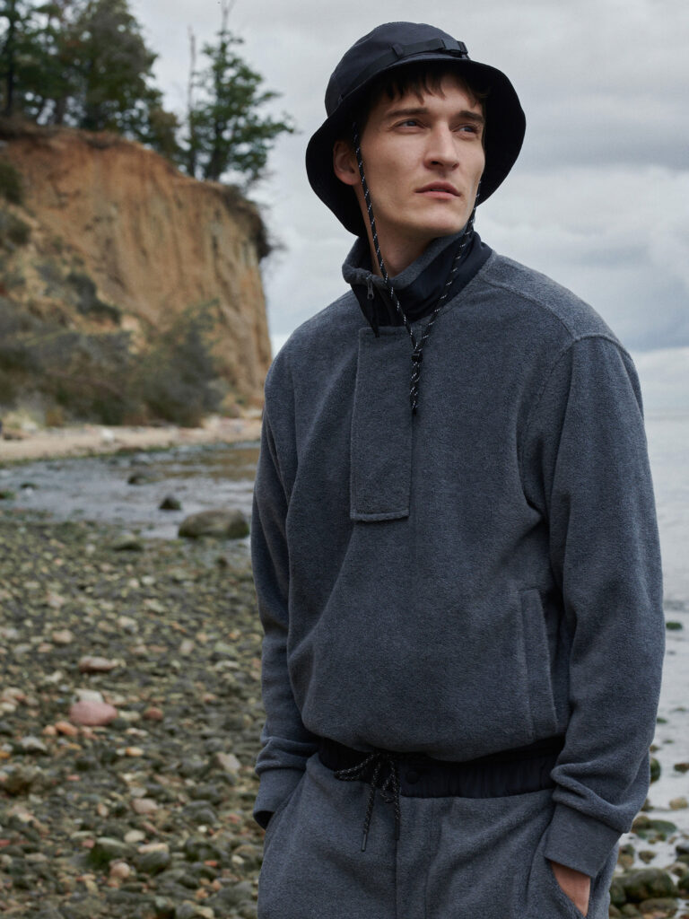 W jaki konkretnie sposób autorzy kolekcji tego dokonali? “Po pierwsze, wspomniana funkcjonalność. Mężczyźni cenią ją dziś bardziej niż kiedykolwiek. Przełożyliśmy ją na pragmatyczne rozwiązania modularne – 3-w-1, ubrania posiadające odpinane elementy, czy też dwustronne. Kurtka “miś”, dla przykładu, to u konkurencji po prostu “miś”, nostalgicznie nawiązujący do lat 90. U nas zaś, adekwatnie do czasów i potrzeb, jest ona dwustronna. Można nosić ją na stronę beżową, ale i wywrócić na odważniejszą, pomarańczową. W kurtkach typu 3-w-1 z kolei, można odpiąć rękawy, otrzymując tym samym kamizelkę puchową; odpinany jest też kaptur, albo i sam jego puszek. Po drugie, niuanse znajdziemy w tkaninach; wiele ubrań ma tu metkę ecoaware. Dużo rzeczy pochodzi z recyklingu, Wspomniany miś, podobnie zestaw polarowy spodni i bluzy, uszyto z poliestru pochodzącego w stu procentach z recyklingu”.
