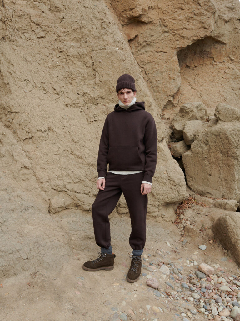 “Taki był zamiar. Każda z tych rzeczy to klasyk klasyków: tworzymy kolekcje premium, by ich elementy można było nosić wiele lat i by każda rzecz pasowała do innych ubrań i współistniała z rozmaitymi trendami. Stąd rzeczywiście są to proste ubrania, które nie wymagają wtajemniczenia w modę, a wygląda się w nich dobrze. No i są twarzowe. Kolory użyte w kolekcji zainspirowały górskie krajobrazy, bezdroża. Stąd dominujące odcienie ziemi – głębokie brązy, szarości, czy szlachetna zieleń. Aura zachodu słońca przełożyła się natomiast na mocno zaakcentowany w kolekcji oranż, który pięknie komponuje się ze stonowanymi barwami. Do tego ożywczy stalowy niebieski, harmonijnie spajający całość. Niuanse pojawiają się jednak nie tylko na poziomie koloru, ale też detalu czy faktur. Tyle że ograliśmy je tak, by osoby, które na ten niuans są wyczulone, dostrzegły i doceniły go, lecz by nie komplikował on doboru stroju tym, którzy niuansów nie potrzebują”, mówi projektant.