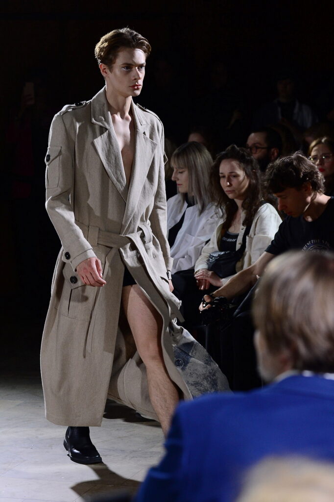 Miejskie graffiti jako forma wypowiedzi w nawiązaniu do przekazu zawartego w modelach płaszczy. Surowe sylwetki o militarnym charakterze są tu niczym czyste płótno, którym autor podkreśla swoją pacyfistyczną postawę.