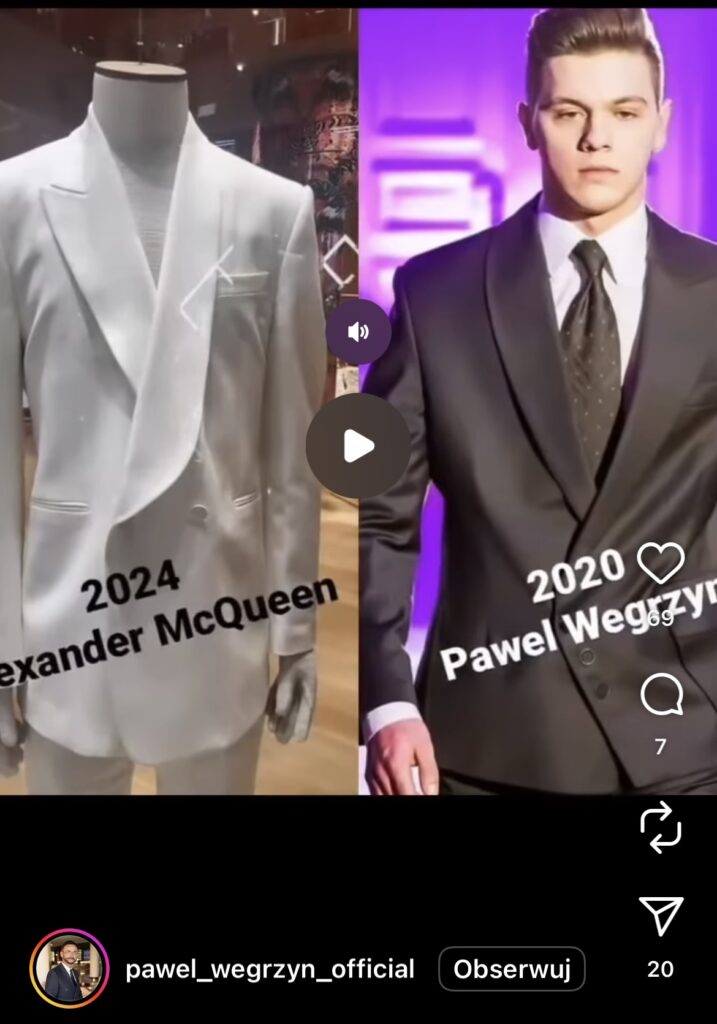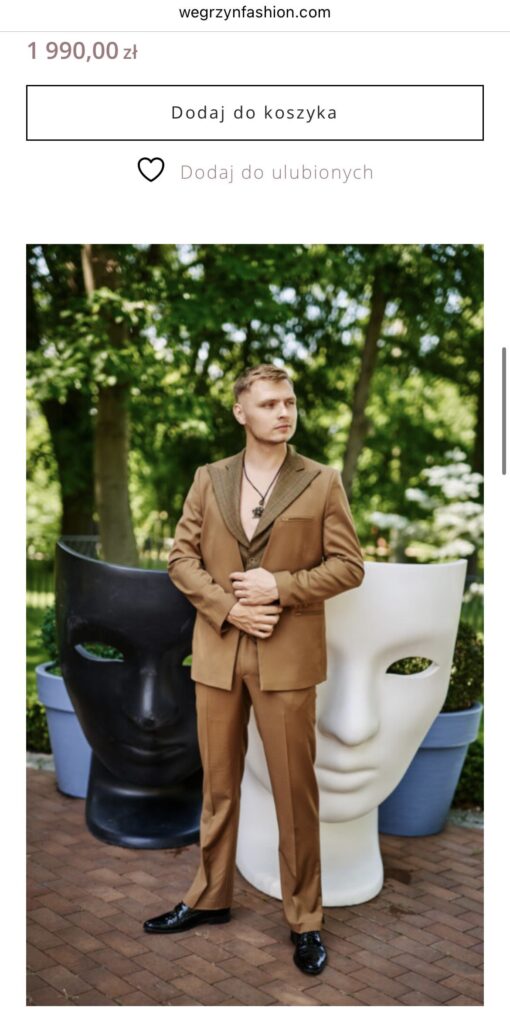 Żeby było jasne: każdy amator może bawić się w modę. Tyle że pan Węgrzyn sam porównuje się do Alexandra McQueena. Na swoją korzyść. Co jednak jest już nadużyciem. Ostatnio dziękował też Giorgiowi Armaniemu za „każde słowo i wsparcie”. Co jest też parodią. Nie jestem w stanie zweryfikować – z oczywistych względów – znajomości kielczanina ze śp. mistrzem Armanim, ale nawet jeśli, nauka poszła w las. Armani miał fach i gust.