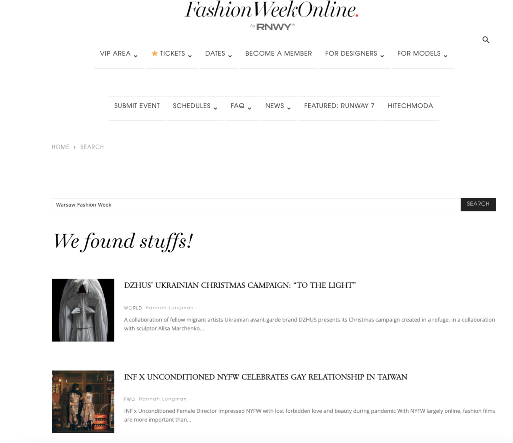 Ale OK, sprawdziłem. Jeśli wrzucić w wyszukiwarkę FashionWeekOnline hasło „Warsaw Fashion Week” – ukazują się dwa artykuły – o (skądinąd świetnej) ukraińskiej projektantce i o… celebracji gejowskich związków na Tajwanie. O Warszawie – nic. No to jak było z tym wpisaniem?