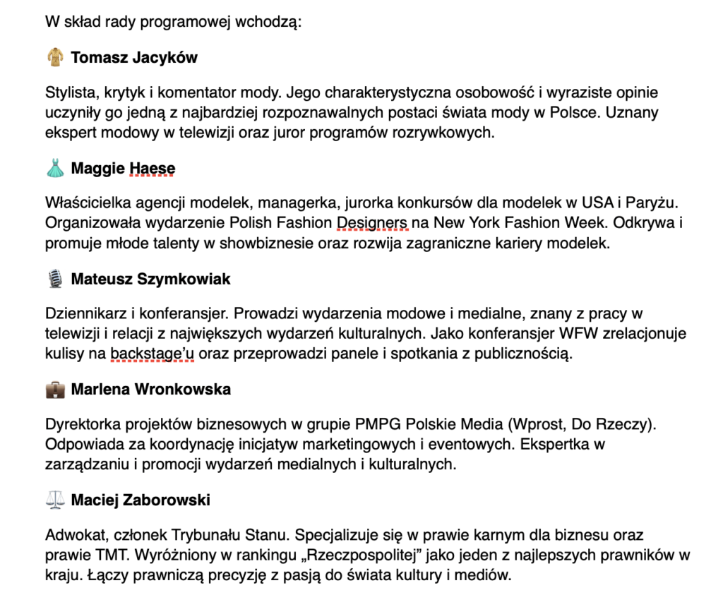 „Nikt nie podawał żadnych konkretów, rzucano ogólnikami, na których nie można było się oprzeć. Zawiodła promocja, zawiodły social media WFW, bo nawet średnio zainteresowana branżą osoba mogła dostrzec, że coś tam jest nie tak. Niepoważne było dla mnie to, że nie legitymizują tego wydarzenia osoby i media* powszechnie znane (i uznane) w branży. Duże wątpliwości powodowały również informacje o wycofaniu się tego czy innego partnera”, powiedział mi jeden z projektantów.