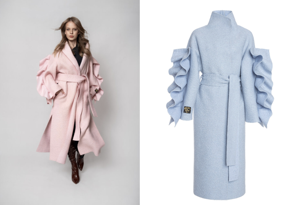 „Ten płaszcz jest ciepły, ale lżejszy; jednocześnie ma swoją sztywność, dzięki której pięknie się układa”, mówi Ewa. Jak dodaje, powiększyła falbany na rękawach, bo Marina po prostu jest wysoka. „Pilnowałam, by te bogate rękawy nie przytłoczyły sylwetki, dlatego wszyłam je niżej, dzięki czemu wokół talii tworzą korzystne załamania”.