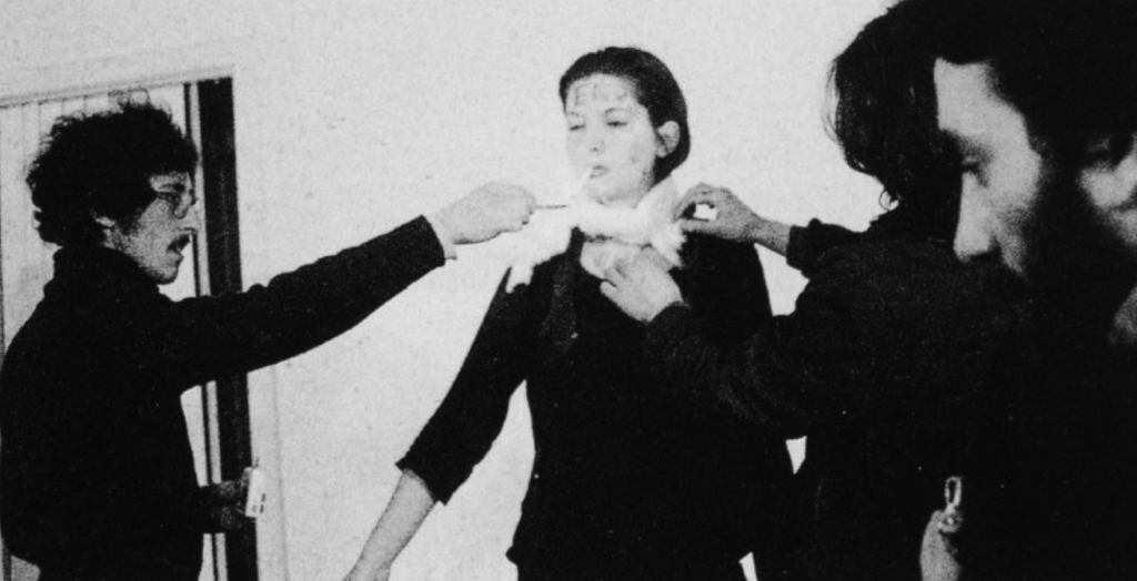 Mowa o wystawionym w Neapolu w 1974 roku „Rytmie 0”, który rzeczywiście Marina omal nie przypłaciła życiem. Przybyła widownia przez kilka godzin mogła zrobić z Abramović, co tylko chciała – artystka stała się przedmiotem w rękach tłumu. A ten stawał się coraz brutalniejszy – Marina była nacinana i kłuta, ściągnięto z niej ubranie. Kiedy „Rytm 0” dobiegł końca, publiczność uciekła, bojąc się konfrontacji z artystką.